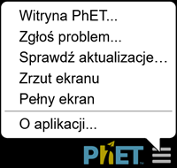 Po kliknięciu logo PhET (na dole po prawej) pojawia się okno zawierające informacje dotyczące symulacji. Możemy tu zmienić sposób jej wyświetlania.