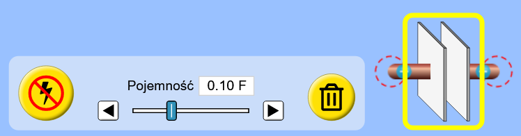 - Kliknięcie kondensatora pozwala ustalić jego pojemność lub, po kliknięciu kosza, usunąć. Dopuszczalny zakres pojemności to 0,05 - 0,2 F.