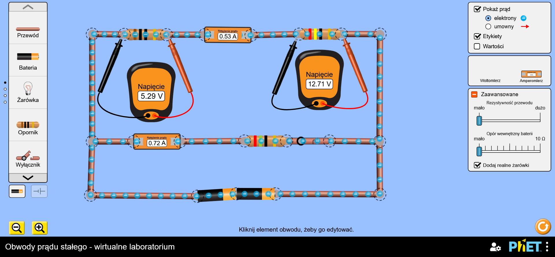 Aby uruchomić to w języku polskim (locale=pl), adres URL będzie wyglądał następująco: https://www.edukator.pl/tik_edukator/circuit-construction-kit-dc-virtual-lab_all.html?locale=pl&addRealBulbs&ammeterReadout=signed