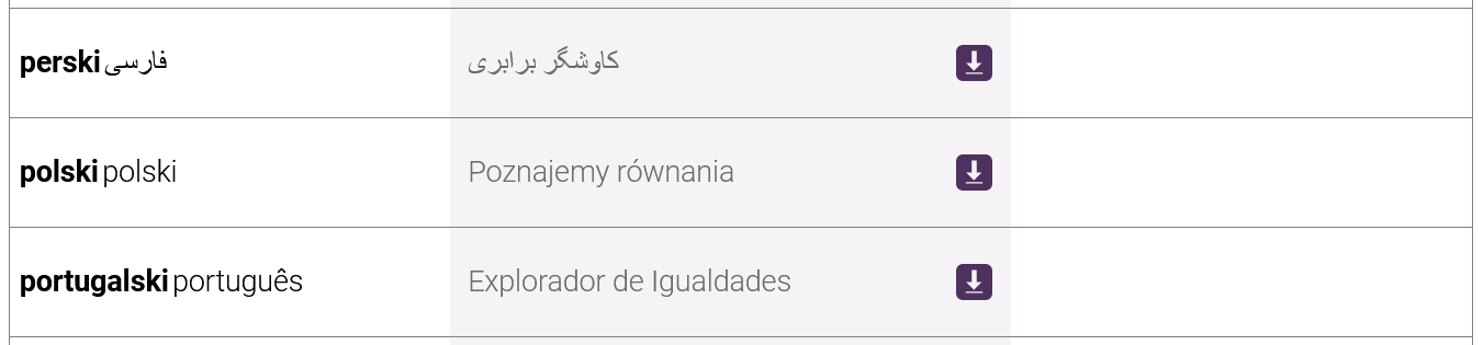 Aby uruchomić to w języku polskim (locale=pl), adres URL będzie wyglądał następująco: https://www.edukator.pl/tik_edukator/equality-explorer_all.html?locale=pl&screens=1,2&initialScreen=2
