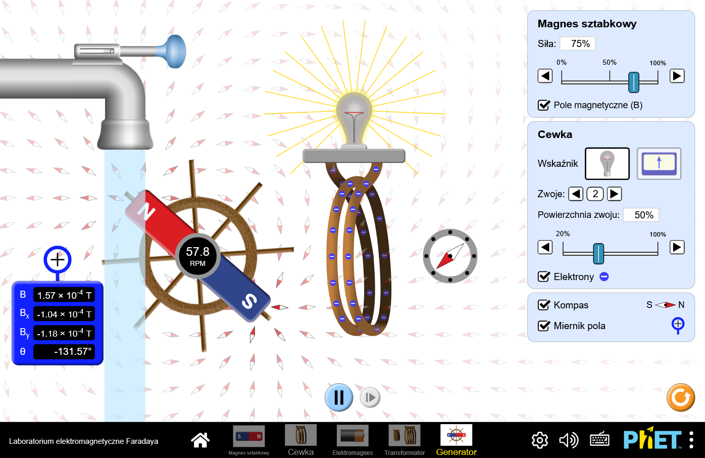 Aby uruchomić to w języku polskim (locale=pl), adres URL będzie wyglądał następująco: https://www.edukator.pl/simulations/faradays-electromagnetic-lab_all.html?locale=pl&screens=1,2&initialScreen=2