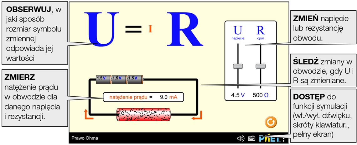 W symulacji uczniowie badają, w jaki sposób zmiana napięcia (U) lub rezystancji (R) wpływa na natężenie prądu (I) w obwodzie.