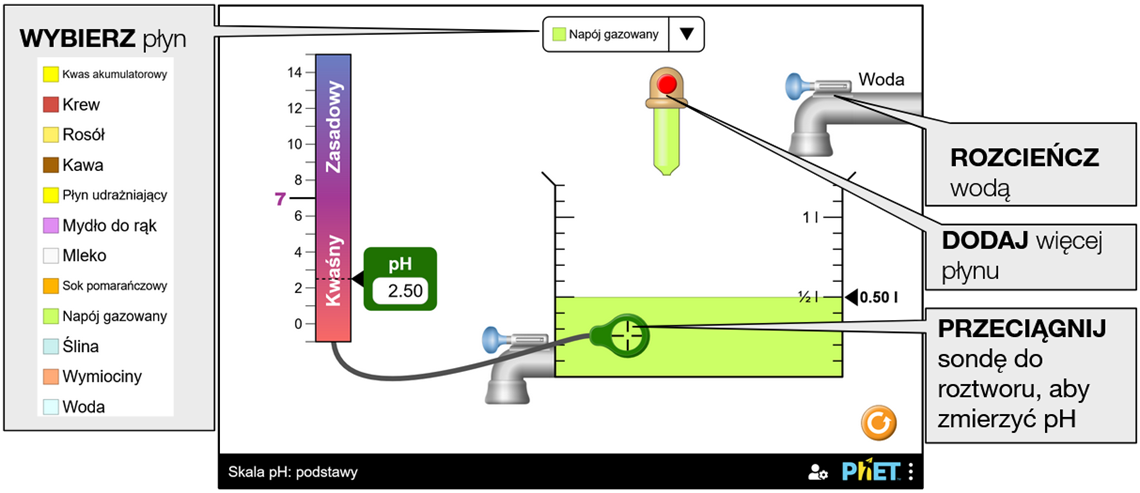 Zobacz wszystkie opublikowane na stronach PhET aktywności dla Skala pH - podstawy tutaj (dostęp do materiałów wymaga zalogowania).