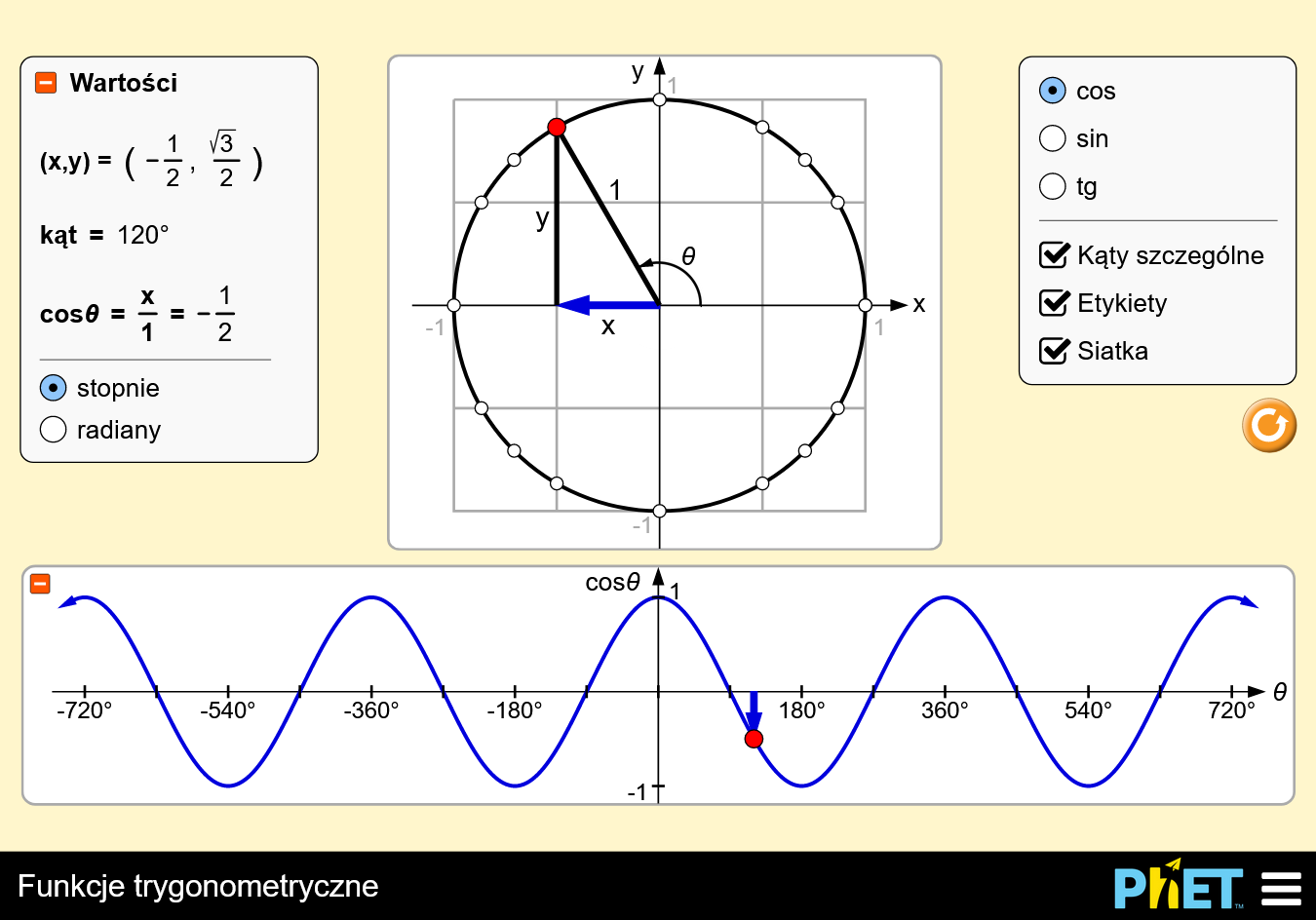 Zobacz wszystkie opublikowane na stronach PhET aktywności dla Funkcje trygonometryczne tutaj (dostęp do materiałów wymaga zalogowania).